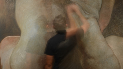 While the subject matter of the Pronaos series is the human body, the themes are fundamental aspects of the human experience: spirituality, transience and place. The artst's intent is to put the viewer virtually and mentally in a transitional place, relegating to the viewer to go beyond and step into the sacred perception of our bodies and lives, or to stay in the superficial view of the skin. Whether looking at a single image or experiencing the paintings collectively in regularly spaced intervals along the gallery walls, a shift towards the language of architecture to discuss the work feels both natural and inevitable.